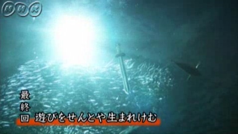 The scene changed with the youthful Kiyomori handling his own ship. Under the sea, the young Kiyomori held the sword Kusanagi and saw his family all welcoming him inside his palace in Miyako. The young Kiyomori laughed as the voices of Yoritomo and Tokiko said, ‘the lost Samurai world of Taira no Kiyomori at Miyako under the sea’.